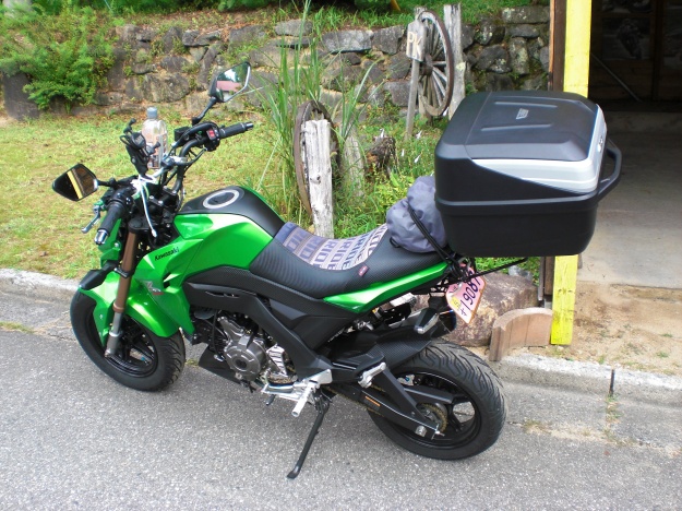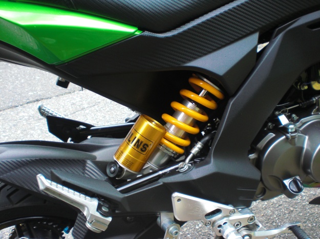 お見送りの朝にZ125を見るとサスはオーリンズ・マフラーはオバーレーシングステップまわり他多数のこだわりには