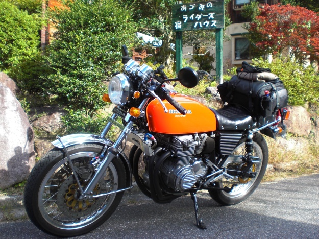 本日ビーナスライン・黒部ダムよりCB400Fライダーさん来てくれました。1974年発売開始 4気筒OHC37馬力エンジン 4 into 1マフラーは当時のホンダ技研が