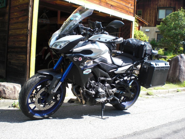 小雨降る夕刻に疲れも見せずに最終宿泊地のガレージに愛車(MT09トレーサー)のサイドスタンドをおろして