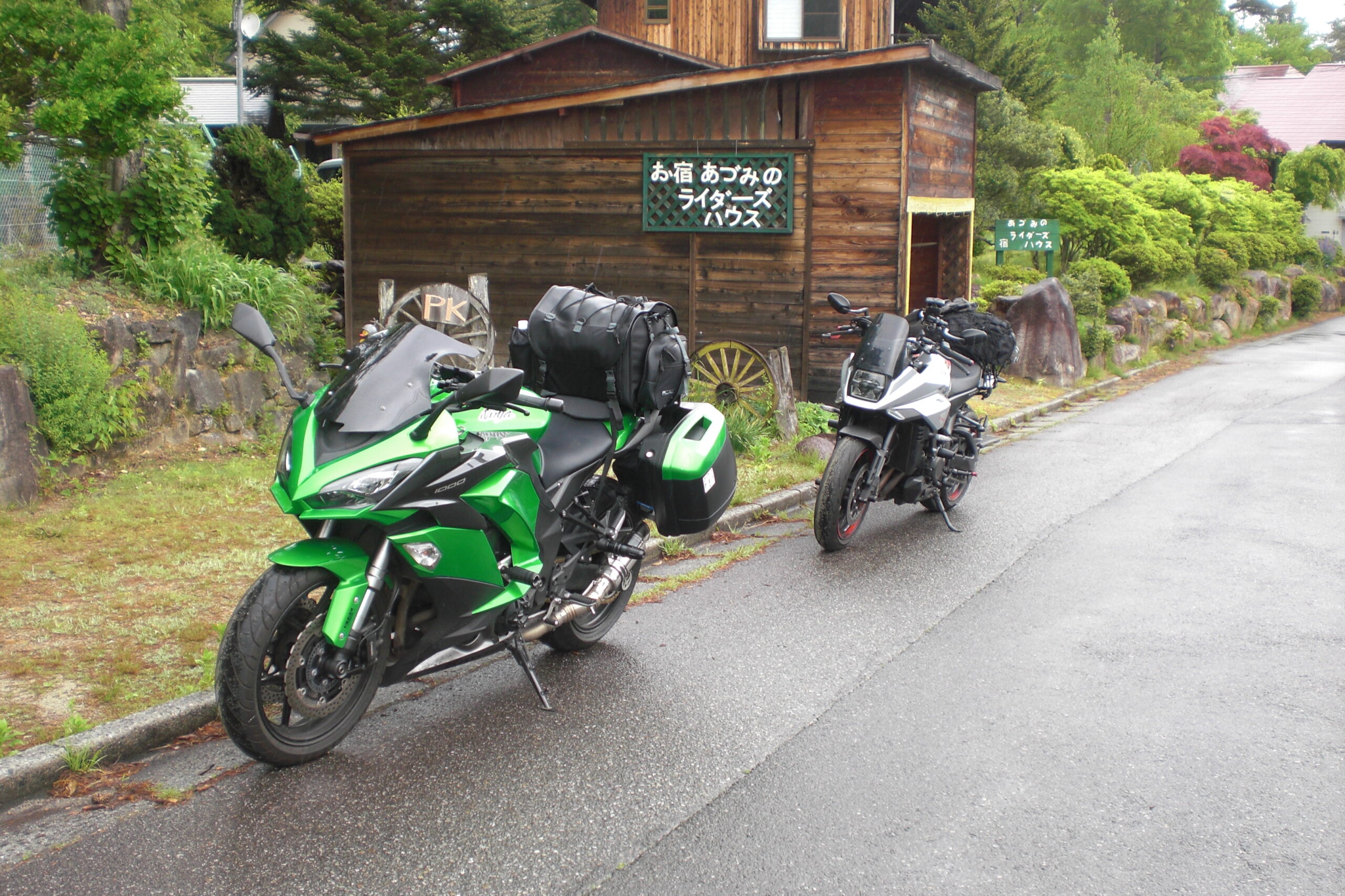 毎年再開している友達が今年も来てくれましたです 飛騨神岡(霜出莊)で合流そして宿泊して積もるバイク話や雑談に時間を忘れて楽しいひと時を過ごしましたが翌日は一日中天気予報は無情にも雨だから京都に帰る予定でしたが雨のツーリングは楽しくはないかもしれないがこれからも長ーいツーリングライフで雨ツーもいくつも経験すれば雨また楽しい事も体験出ると説得して予定どうりにあづみのライダーズハウに来てくれましたよ、気の合った雨天での楽しい・・・?