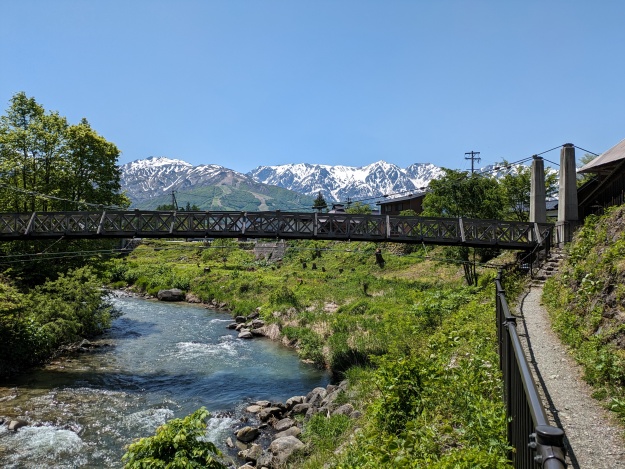 連泊の2日目はご一緒に新緑の白馬方面をくまなくまわりランチ(とんかつ https://tonkatsutsumugi.wixsite.com/hakuba-tsumugi一押し)を済ませてから行った北アルプスの展望が素晴らしい大出公園展望台(大出吊り橋)にはとても感動してもらったです。