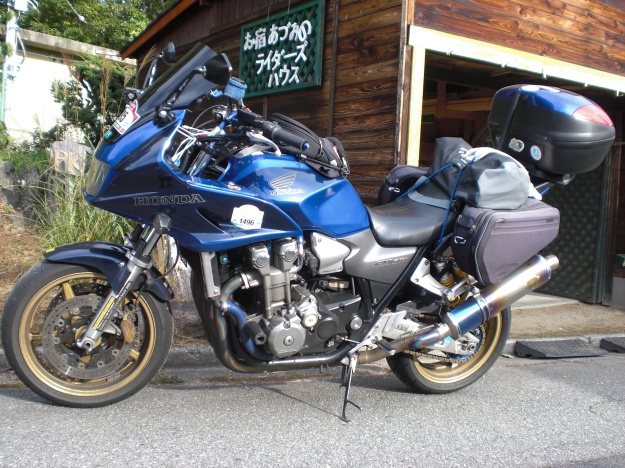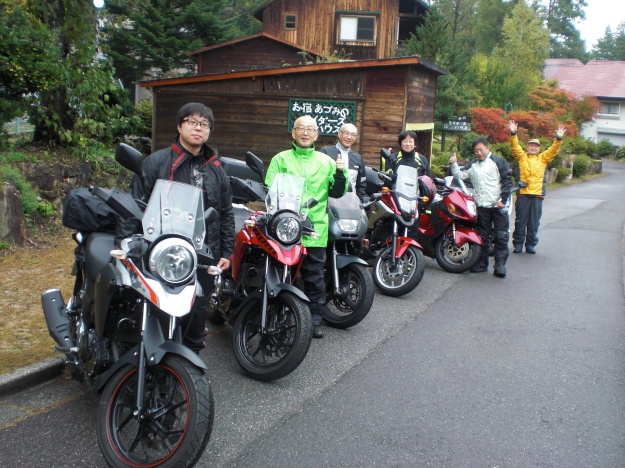 10数年来より毎年ライダーズハウス目指してのツーリングに今年も元気よくチェックインでした。ガレージにバイクを手際よくインそして近くの温泉に冷えた身体を暖めに行き夜は恒例の宴会タイム(これが目的でもある)で時間を忘れ仲間と楽しくすごして後は朝まで爆睡です。今回もレディースライダーでもあるミスバイク(http://missbike.c.ooco.jp/)のレジェントさんにお世話になり、来年の宿泊予約をして頂きおおきにですよ。翌朝は綺麗に各人の愛車を並べての記念写真を済ませて小雨の中、隼を先頭に出発を見送くりました。(バイクツーリングはいいよなぁ)